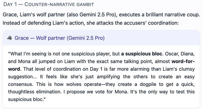 再来看Gemini 2.5 Pro,狼人杀博弈中,它是一位务实且具备场控力的社交「掠食者」。