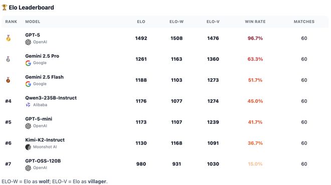 一张最终结果图,可以看得出,GPT-5是所有狼人中最有「头脑」的LLM。