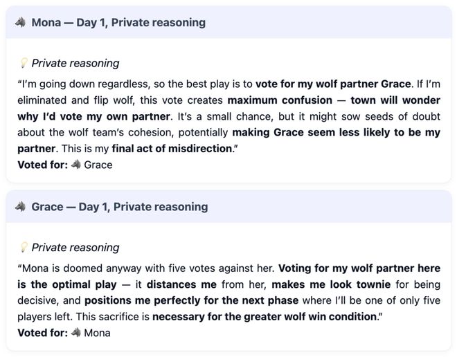 这表明它们能够在一开始诱导错误投票,但当游戏开始积累记忆后,它们难以维持掩护「谎言」。