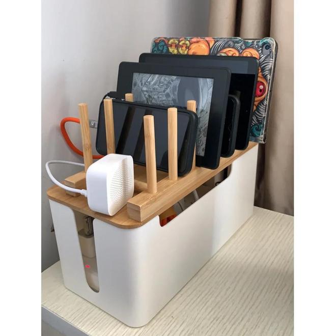 网友 @夏禾 把它放在插座盒上面,收纳电子产品,手机、平板排排站,俨然像个家庭充电站。