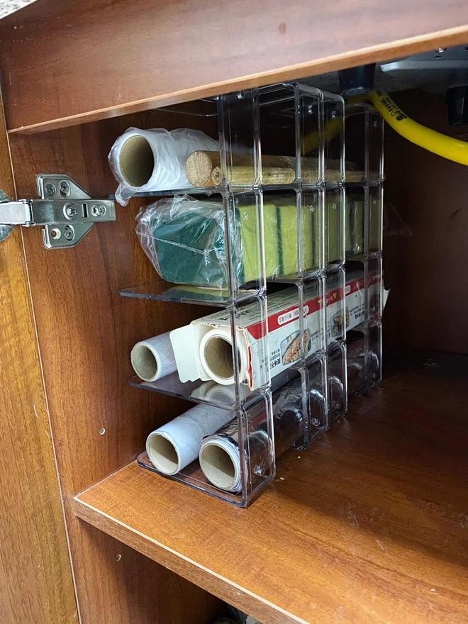 网友 @佳姐姐把它用在厨房,分隔收纳保鲜膜,擀面杖,锡纸这种长条物品,整整齐齐,一目了然,拿放方便。